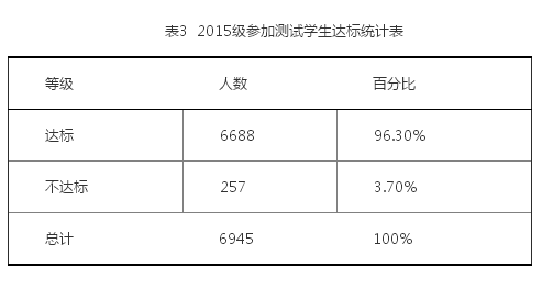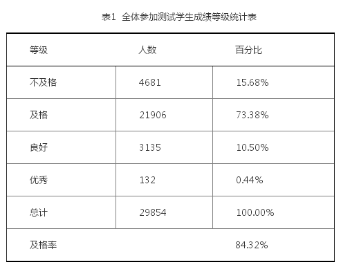 各年级学生测试数据于2018年12月31日前上报全国学生体质健康标准数据管理中心。聊城大学在校大学生中,测试成绩有效的学生共有29854人,测试的及格率为84.32%,其中,2015级学生及格率为60.58%。应届毕业生四年体质健康综合评定合格率为96.3%。