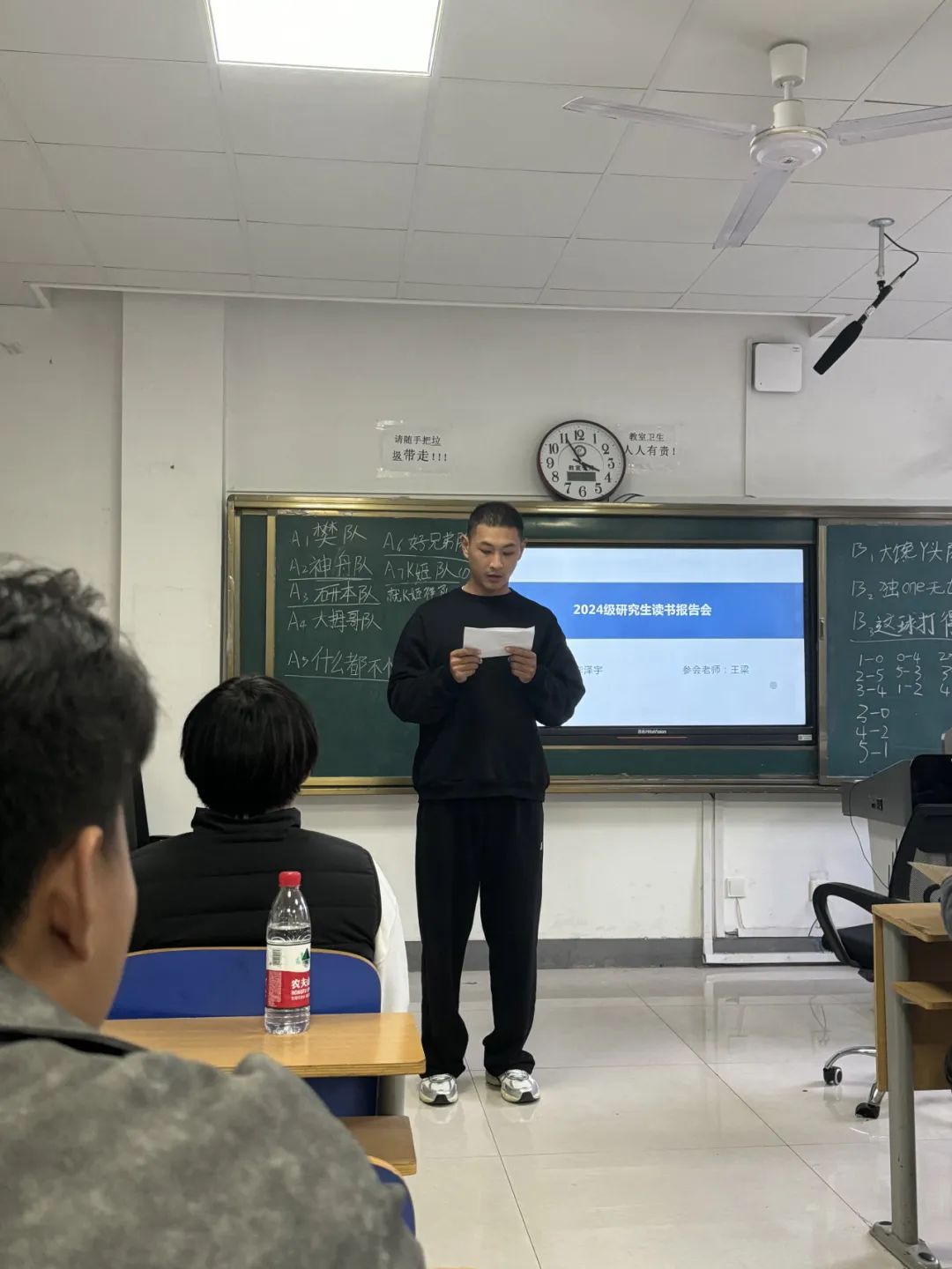 以书为伴,不负韶华。为了鼓励大家养成良好的阅读习惯,促进知识与思想的交流。11月12日下午在5-110教室开展体育学院研究生读书报告会。本次活动由2024级研究生李泽宇主持,体育学院王梁老师、2023级部分学生以及2024级全体研究生出席本次会议,2024级研究生崔顺顺、马晓晴、王安琦、进行了相关汇报。