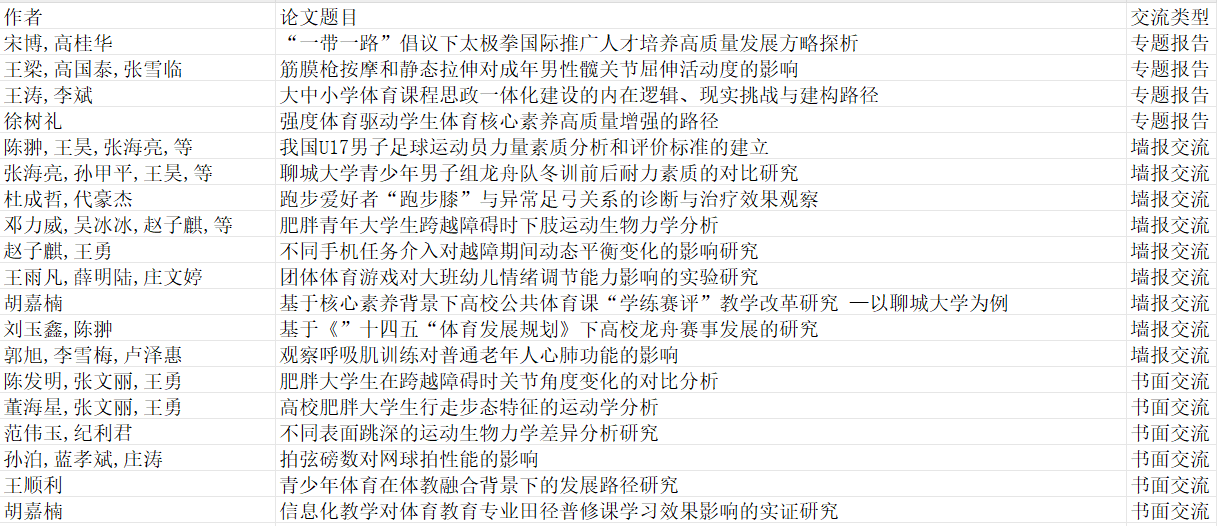 本次大会以“科技赋能体育强国”为主题,我院师生19篇论文入围,其中,专题报告4篇、墙报交流9篇、书面交流6篇,充分彰显了体育学院在学科建设、科研水平以及人才培养方面取得的成效,我院在第十三届全国体育科学大会所取得的优秀成果,不仅激发了师生潜心进行体育科学研究的热情和动力,也必将助力我校体育科研事业迈向高质量发展新征程。