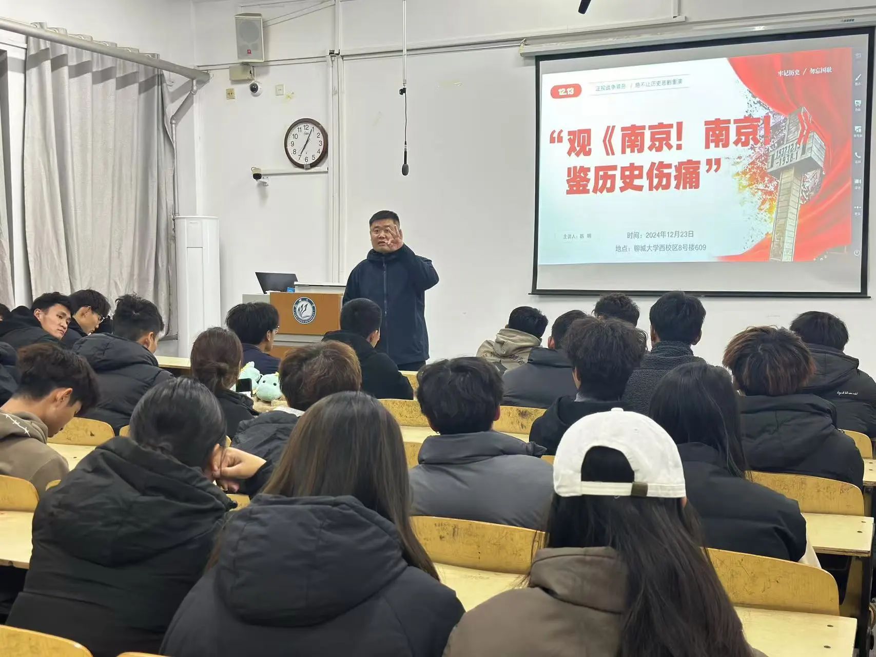 为引导广大学子厚植爱国情怀,赓续红色血脉,担当时代使命,增强民族历史厚重感与认同感。体育学院于11月23日在西校区 8#609 教室举办了“观《南京!南京!》,鉴历史伤痛”星火影院观影活动。体育学院团委书记陈明担任主讲人。