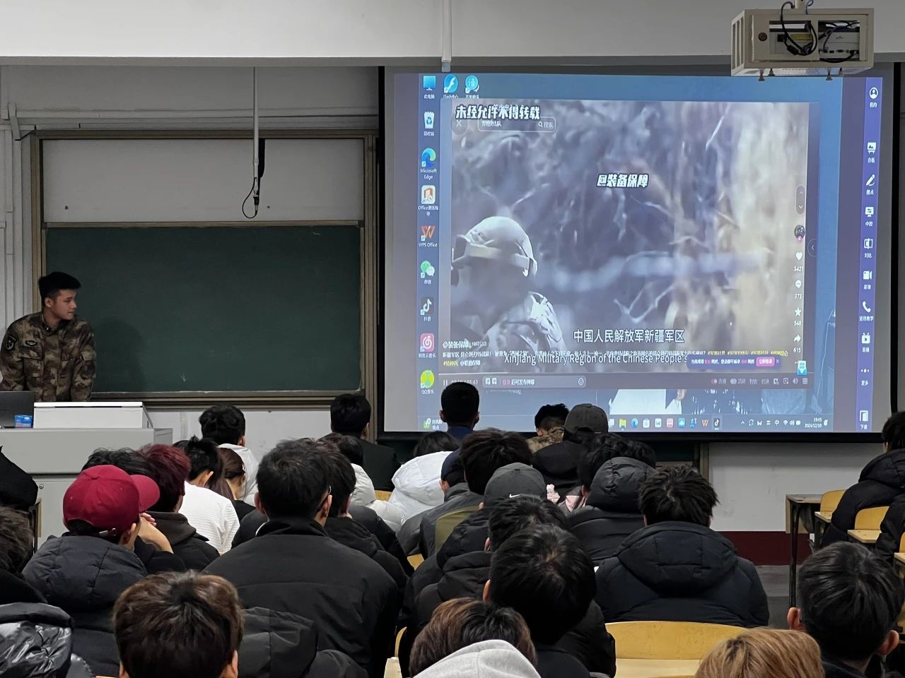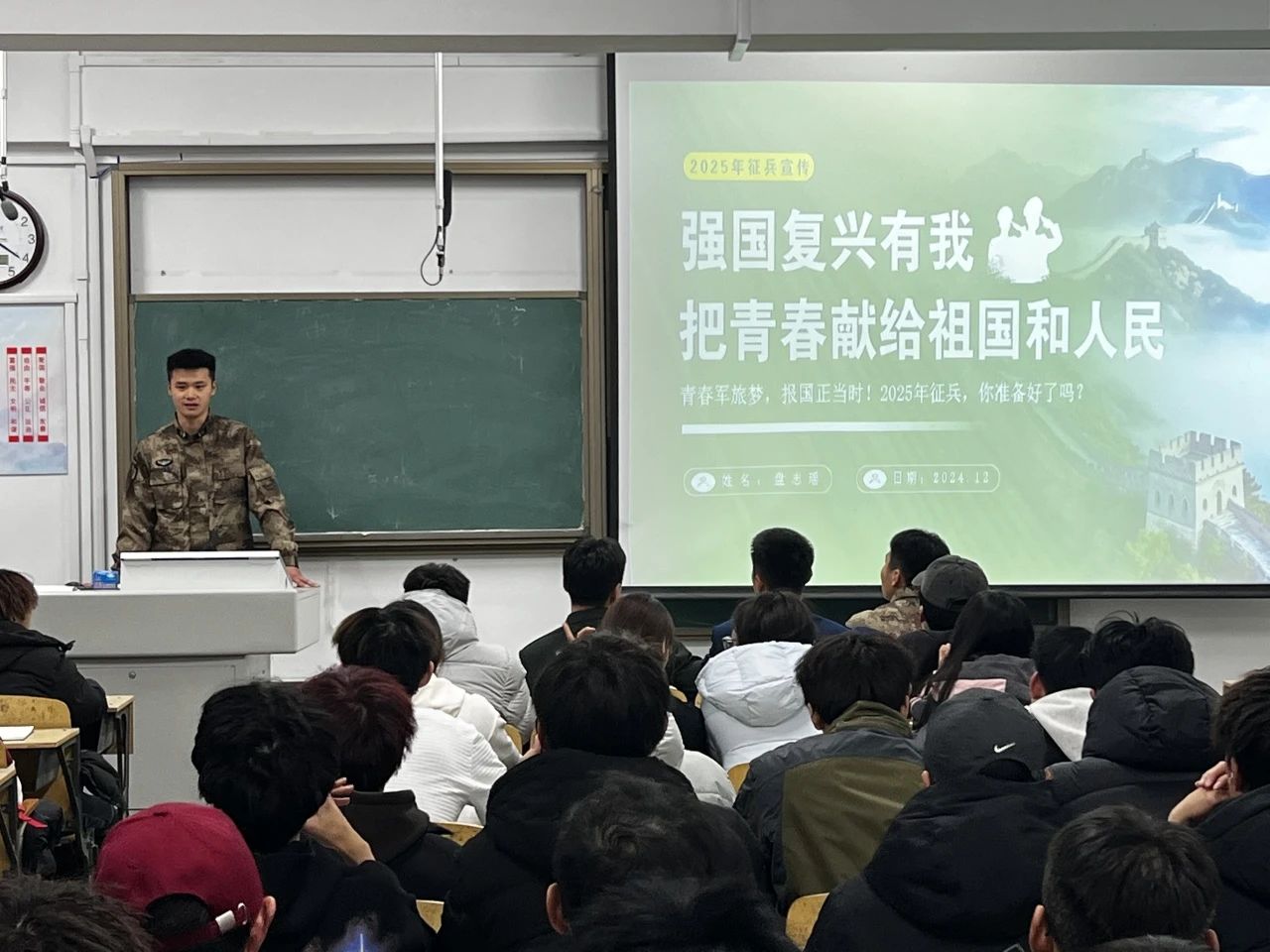 为响应国家号召,增强学生的国防意识,培养青年人才,体育学院于2024年12月10日在西校区8#511教室开展2025年征兵宣讲活动。参与本次宣讲活动的有体育学院退役复学学生李帅、盘志瑶、卢世伟、梅锡晨、李硕以及全体24级学生,活动由体育学院辅导员王鑫主持。