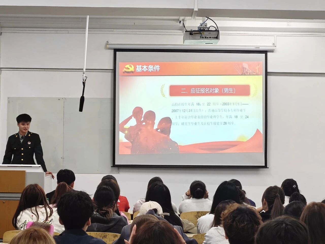 宣讲会伊始,学院辅导员王鑫老师率先登台宣讲拉开活动序幕。他从“国防建设刚需”与“民族复兴使命”双重视角,深刻阐释征兵工作的时代意义并结合体育生“体能强、协作优”的专业特质入手系统解读了入伍“政治审查、身体条件、文化水平”三大核心标准和具体政策红利,直观展现参军对个人成长的多重价值,号召在场学子以专业所长赋能国防,在军营中实现人生进阶。