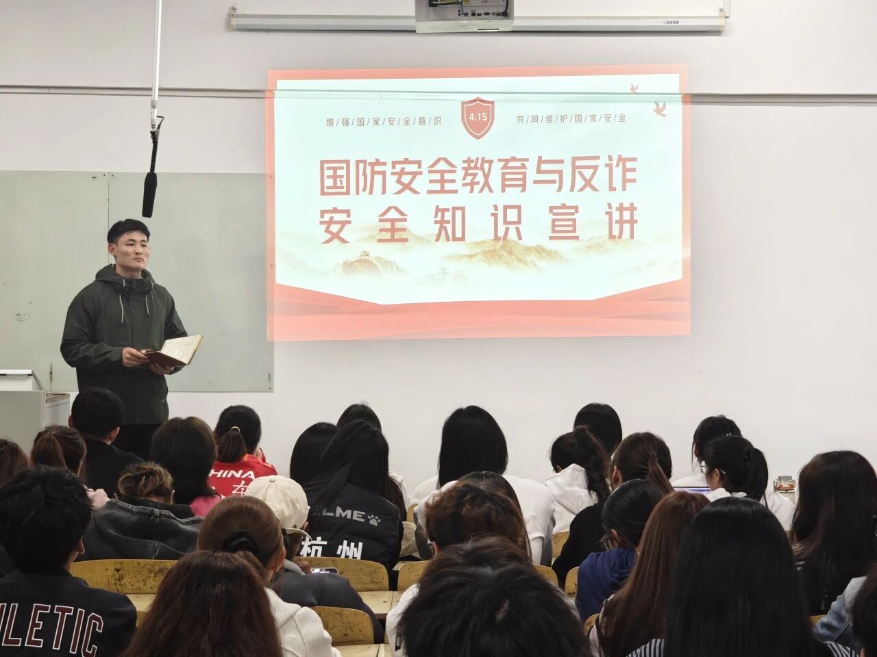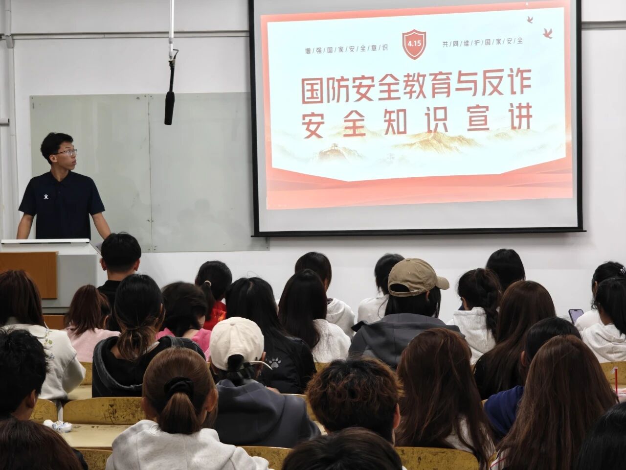 活动伊始,王鑫老师以国家安全为核心切入点,结合国际形势与历史案例,系统阐释国防安全的深层内涵,从国防法规细则到个人应尽国防责任,引导同学们建立“国防无小事,人人尽义务”的认知。紧接着,王鑫聚焦电信诈骗、网络诈骗等安全风险,结合真实案例拆解“杀猪盘”“虚假购物”等骗局的操作逻辑。然后又针对宿舍安全管理进行了强调,如用电规范、作息纪律、早操出勤与夜不归宿等校园安全要点展开讲解,现场通过互动问答强化知识吸收,同学们积极参与、氛围热烈。活动尾声,王鑫再次强调安全意识的日常化实践,呼吁大家将所学转化为行动自觉。