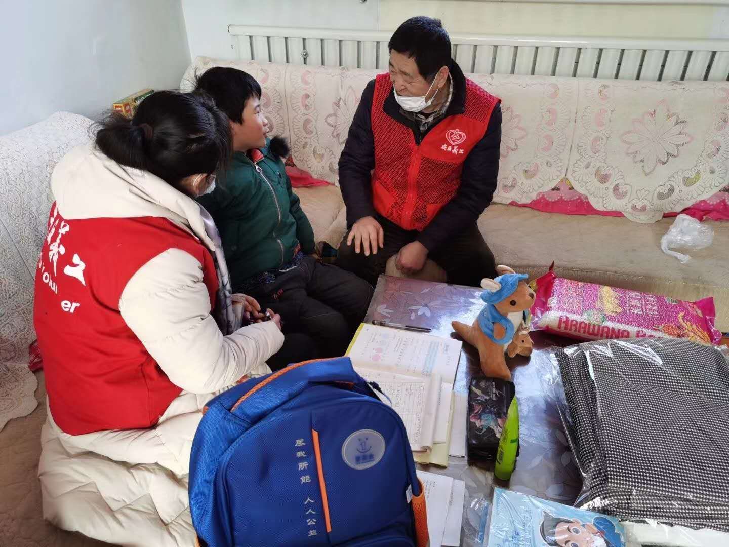 寒假返乡的聊城大学体育学院安丘籍大学生和安丘市爱心义工志愿者们三五一组,走访安丘市辉渠镇温泉小学家庭经济困难的学生,切实解决困难学生在学习和生活中遇到的问题,让贫困学生能够安心读书、健康成长。每到一户,志愿者们首先详细解贫困学生的家庭情况和实际困难,利用自己的专业知识进行有针对性地心理辅导。同时,勉励每一个贫困学生要正视困难,树立信心用知识改变命运,用优异的成绩回报社会。志愿者们还为每位贫困学生家庭送上食用油、大米书包以及学习用品,让贫困学生和家长在寒冬中感受到来自社会的关爱。