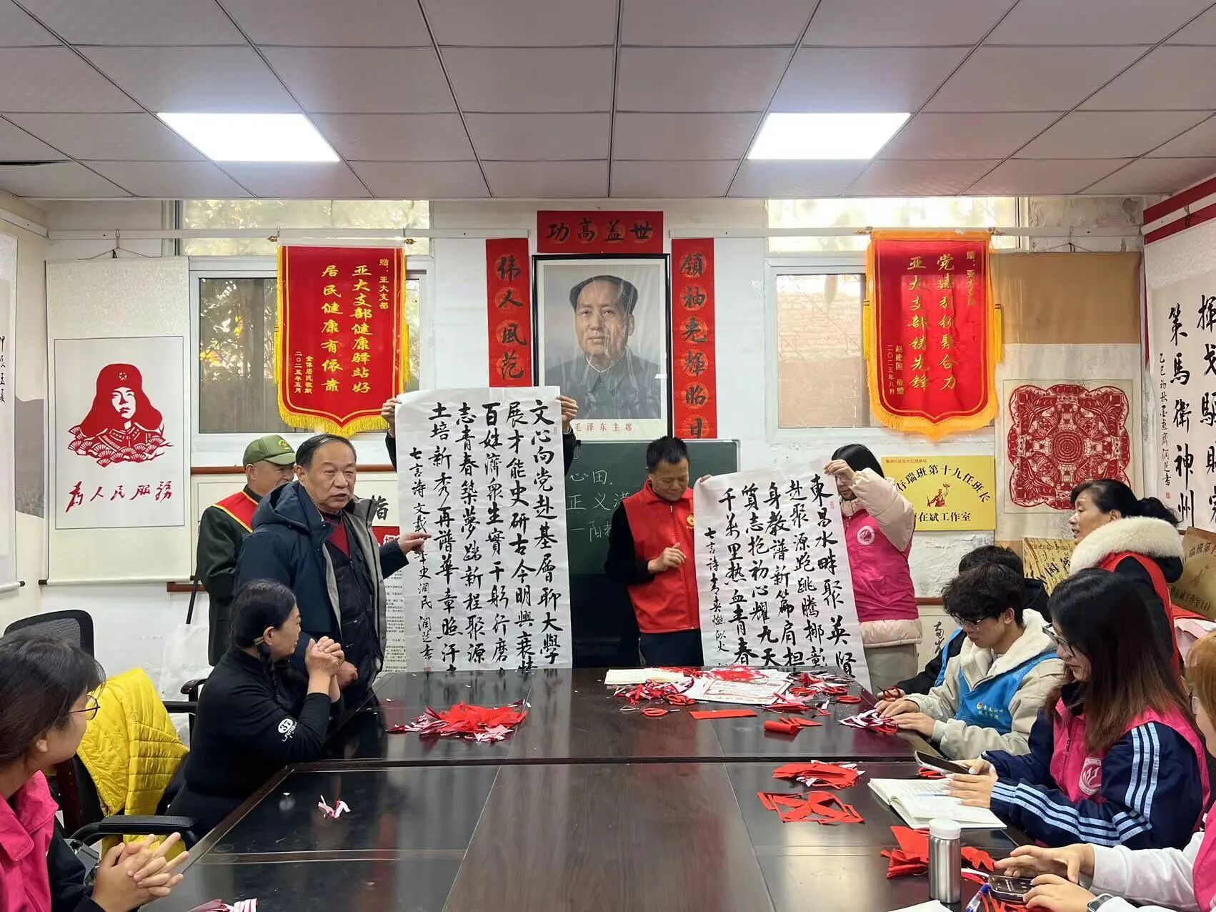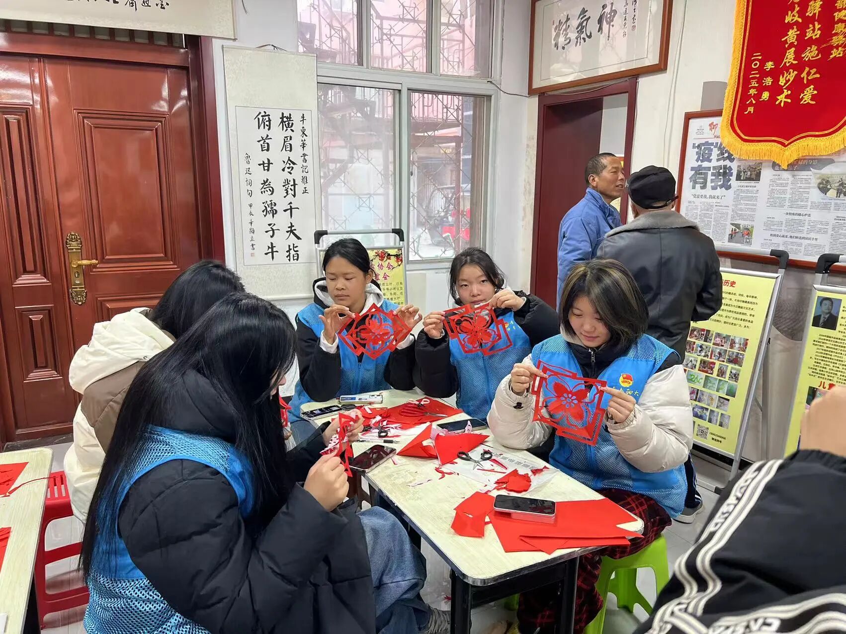 活动开始前,志愿者们与社区充分对接,精心布置场地,统一管理剪纸工具,并准备了应急物资,确保活动安全有序展开。在剪纸环节,社区老师细致讲解剪纸的历史与技法,并生动讲述了董存瑞等英雄事迹,将红色文化融入指尖艺术。志愿者们认真聆听,动手实践,在一折一剪中感悟非遗魅力,也接受了深刻的爱国主义教育。剪纸环节结束后,志愿者与社区太极老师共同带领大家学习太极基础动作,并讲解相关养生知识,帮助大家树立健康生活理念。中医老师为志愿者们把脉问诊,让志愿者了解中医知识,认识中医文化。