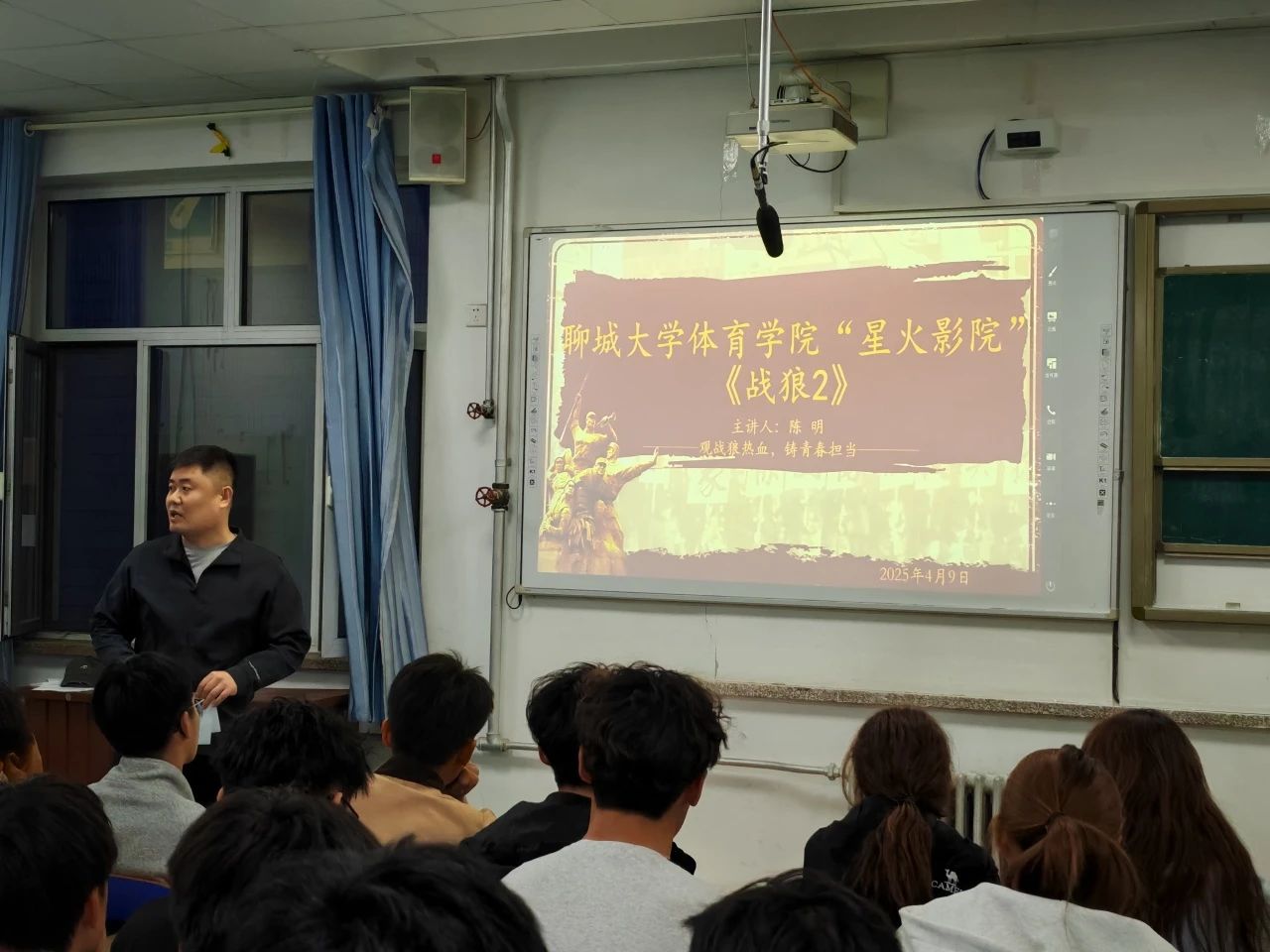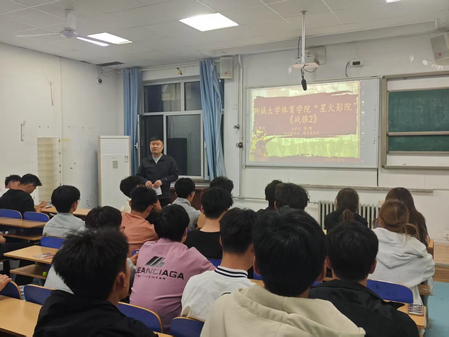 为丰富大学生课余生活,厚植爱国主义情怀,2025年4月9日,聊城大学体育学院秘书部在西校区体育学院406教室组织开展大学生观看爱国主义影片《战狼2》活动,体育学院团委书记陈明担任主讲人。 影片放映前,陈明老师向同学们介绍了《战狼2》背后的创作历程、影片所承载的爱国主义精神内涵,以及其在影视文化领域和社会层面产生的广泛影响。同学们认真聆听,对影片的理解更加深刻,也对接下来的观影充满期待。 影片播放过程中,紧张刺激的战斗场面、扣人心弦的情节深深吸引了在场的每一位同学。冷锋在枪林弹雨中无畏战斗,以及中国军队关键时刻展现的强大力量,让现场气氛持续高涨。同学们的情绪随着剧情不断起伏,被影片中浓厚的家国情怀所深深打动,现场掌声不断。 此次观影活动不仅为同学们带来了一场精彩的视听享受,更在陈明老师的讲解和影片的双重感染下,让爱国主义精神深深扎根于同学们心中。同学们纷纷表示,将以更加饱满的热情投入到今后的学习和生活中,勇担新时代青年的责任与使命。 (编辑人:李书婷)