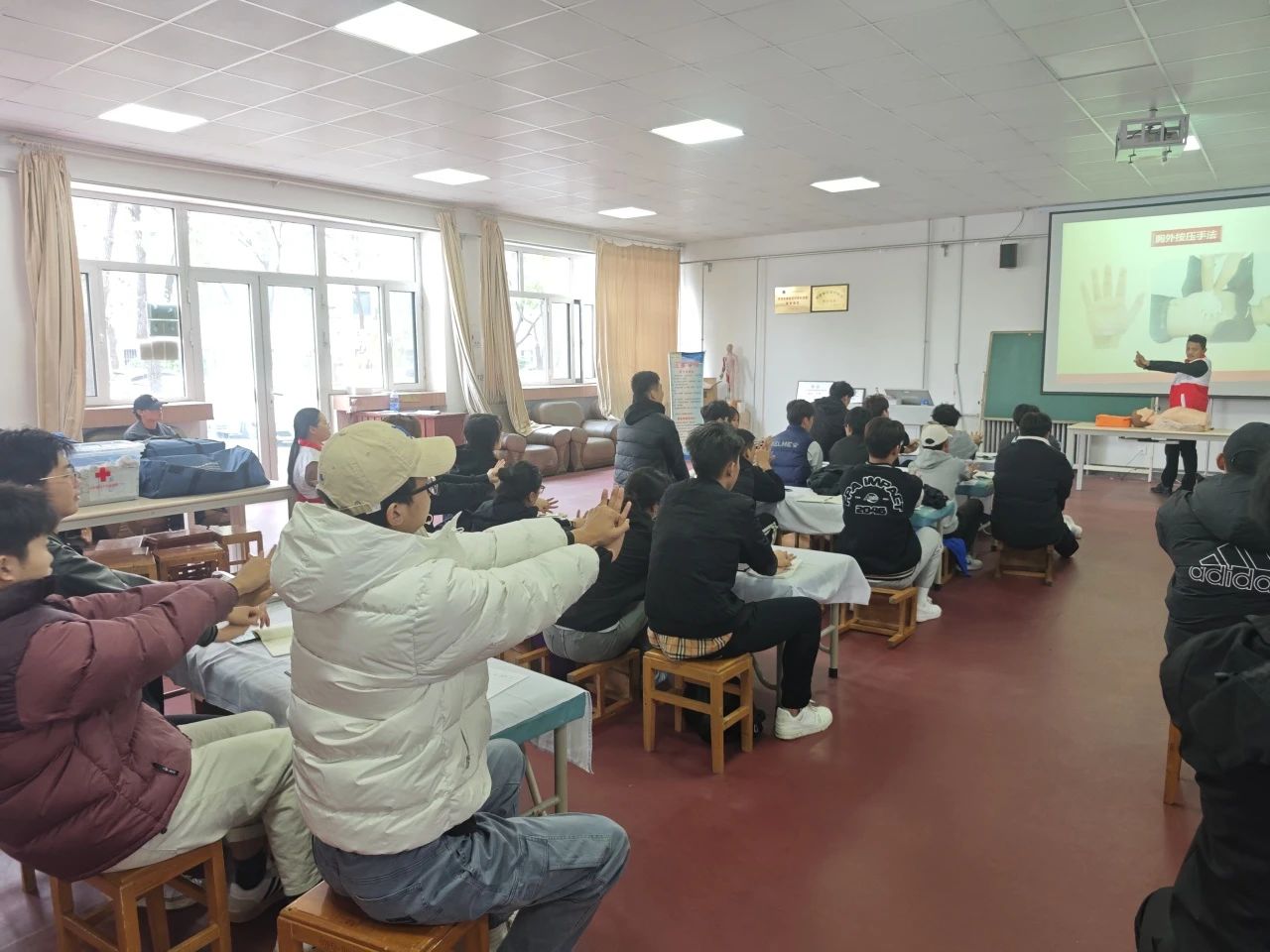 活动开始由红十字会的救护员老师为大家详细的讲解了红十字会的起源、现场救护的原则、心肺复苏的急救技能及AED的使用技巧。老师们用通俗易懂的语言、生动具体的案例向大家详细讲解了救护概论、心肺复苏、AED使用、气道异物梗阻急救、创伤救护、应急处置等急救技能和相关知识。现场授课互动频繁,让同学们深刻认识到应急救护的重要性。