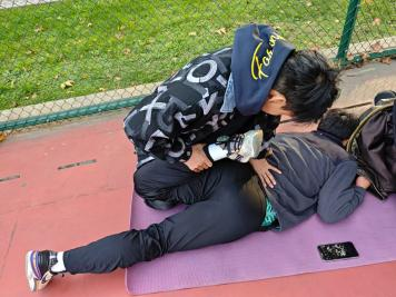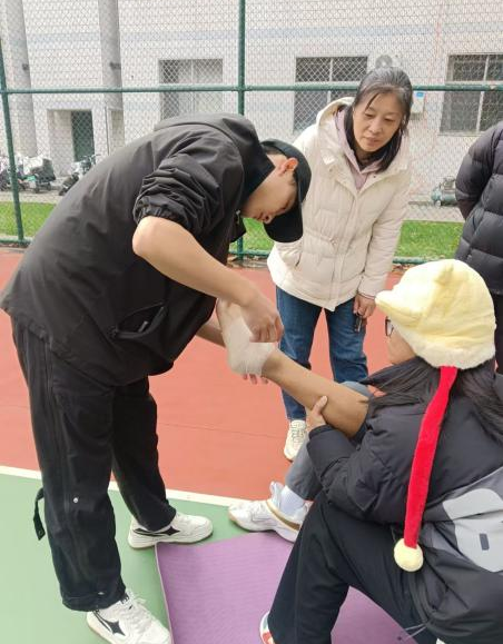 在比赛现场,运动康复协会的同学保障工作全面展开。一方面,配备了专业的医用绷带、皮肤膜、白贴等,由康复协会的同学们轮流值守,随时准备应对可能发生的意外伤害和突发疾病,为参赛人员提供及时有效的医疗救治保障服务。另一方面,康复协会的同学们还向参赛人员普及赛前拉伸知识和伤病的预防方法,提高他们的自我保护意识。运动康复协会的同学们用专业的医疗知识和无私的奉献精神,为参赛者的健康与安全筑起了一道坚实的防线,完美诠释了奉献、友爱、互助、进步的志愿精神,他们的辛苦付出得到了各参赛运动员们的一致好评。