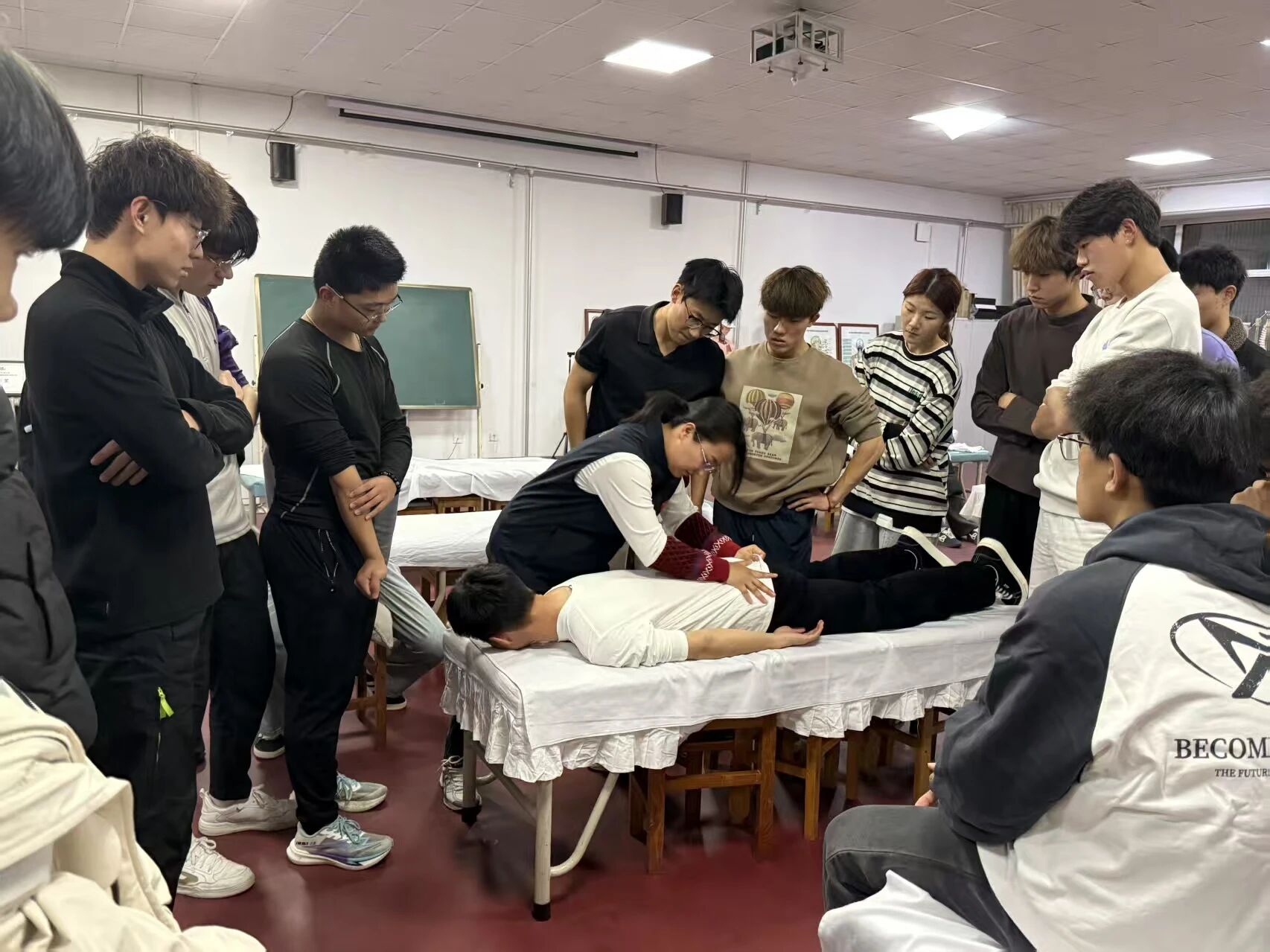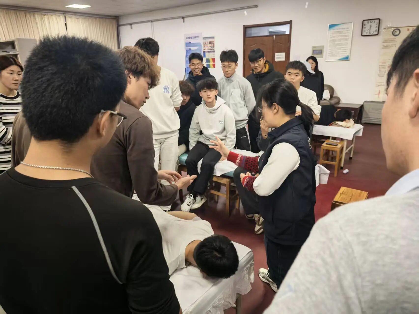 崔梦超结合自身临床实践经验,聚焦同学们在基础按摩手法中常见的发力方式不当、动作规范性不足等问题,采取“理论拆解 + 一对一纠错”相结合的教学方式,系统讲解了动作发力的关键要点、关节角度的控制方法以及安全操作规范。她重点纠正了部分学生存在的肌肉代偿习惯与动作幅度不足等问题,帮助大家从细节上提升操作质量。
