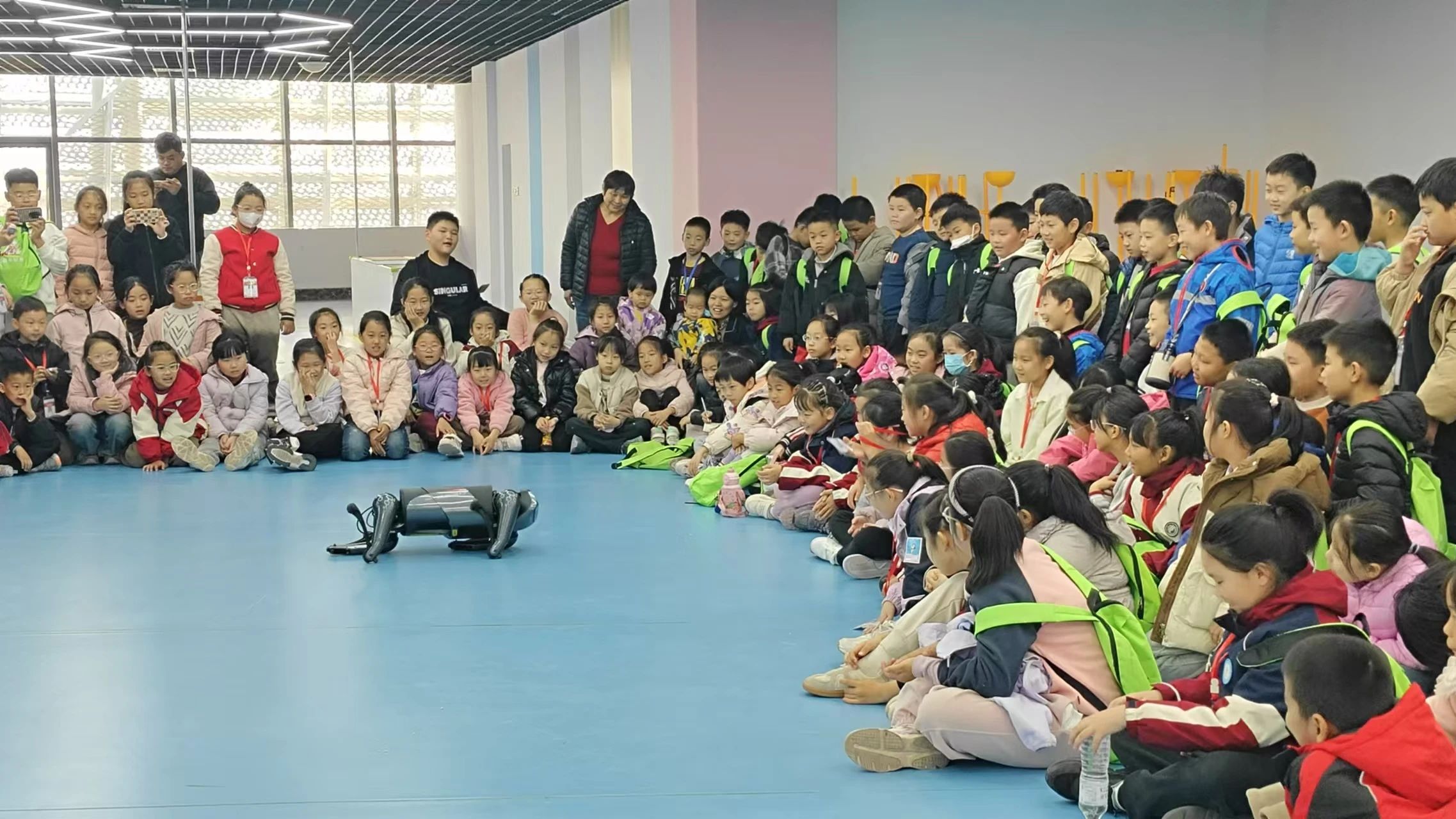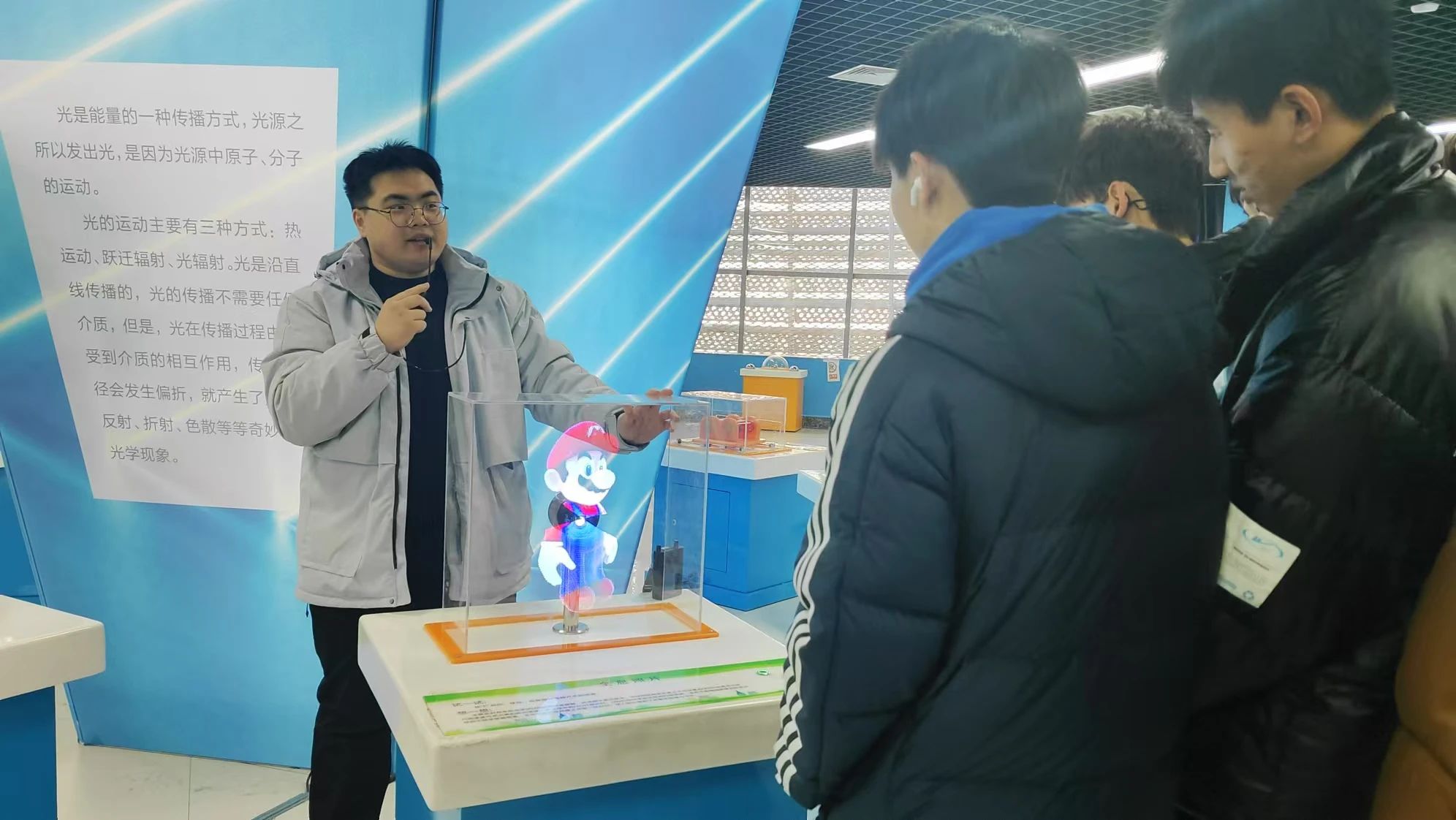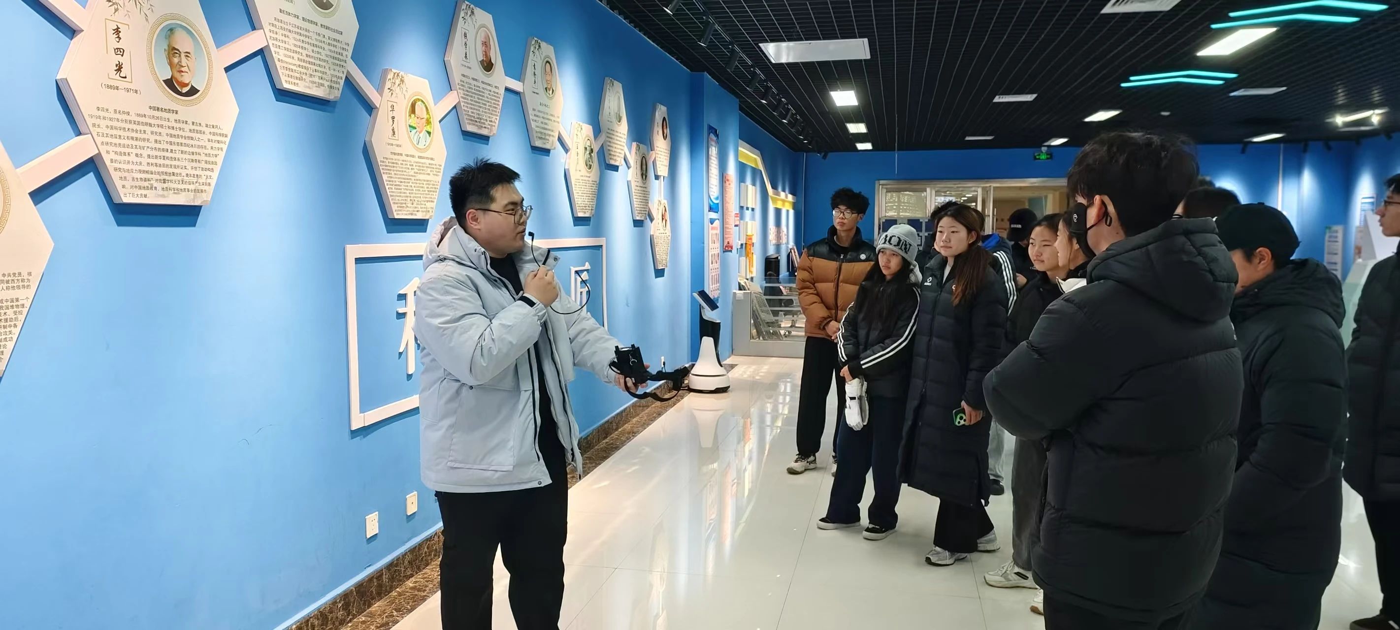 学生们有序进入科技馆进行参观,科技馆内设有多个主题展厅,在讲解员的带领下,同学们仔细阅读 墙板上与科技发展历程有关的资料,深入了解到在我国科创发展领域做出杰出贡献的科学家。在聆听讲解员介绍的同时,同学们亲身体验了场馆内的科技装置,并在人工智能创客空间观看和学习了各种有趣的物理知识,操作模拟飞行器、无人机编程、观看了无人机表演等前沿科技项目,使同学们更加直观的感受到科技的魅力。同学们组成小组积极探讨装置项目中蕴含的科学原理,也更加坚定了同学们科学实践的决心。