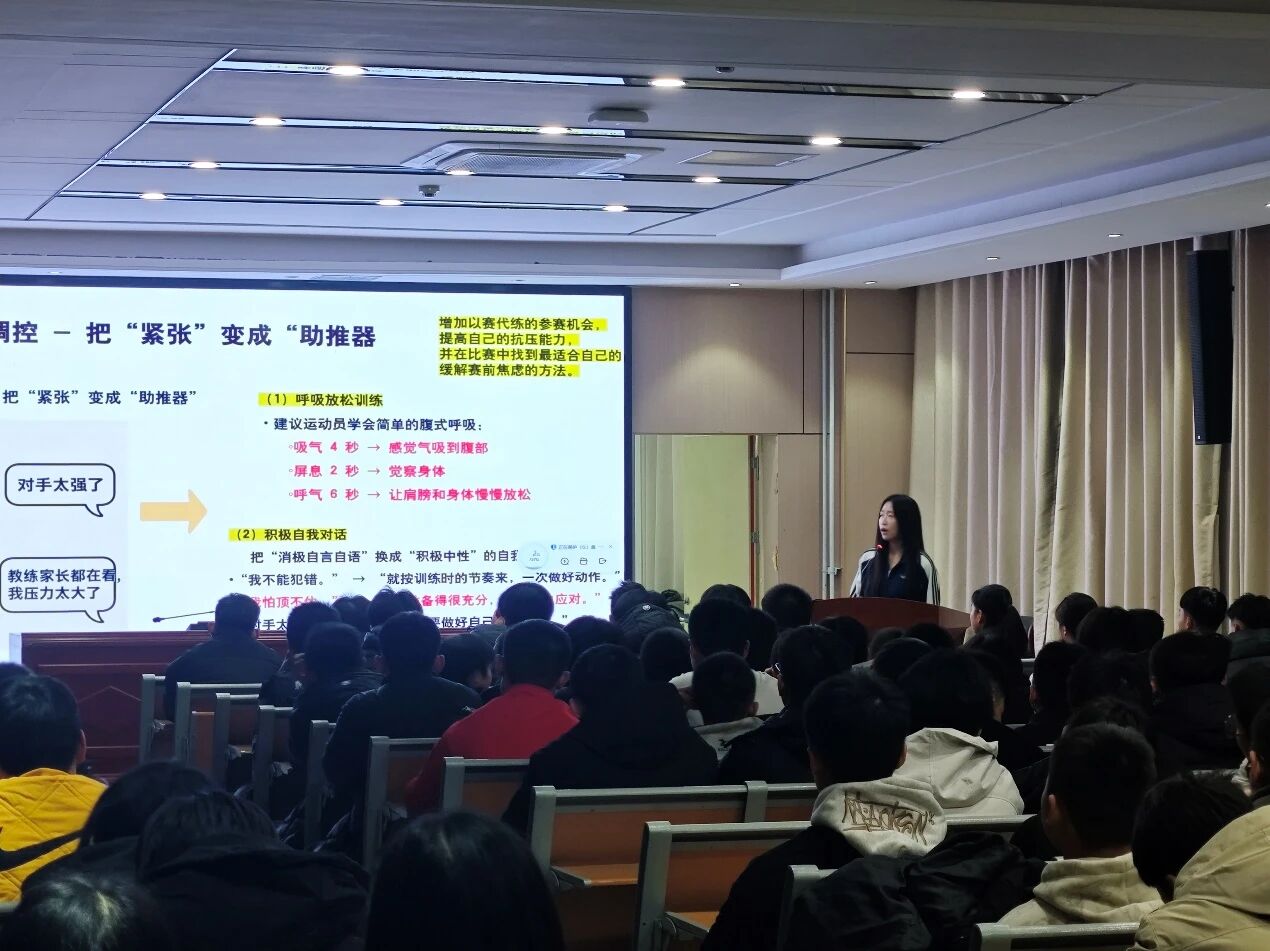 为帮助竞技体育后备人才突破心理瓶颈,提升赛场抗压能力,近日,聊城大学体育学院范峥峥老师受邀走进聊城市竞技体育学校,为该校田径、技击、球类与力量、水上和射箭等项目的重点队员带来一场主题为“心赋能·竞出彩”的运动心理专题讲座。这场兼具专业性与实用性的“心理补给”,让即将备战省市级赛事的运动员们收获颇丰。